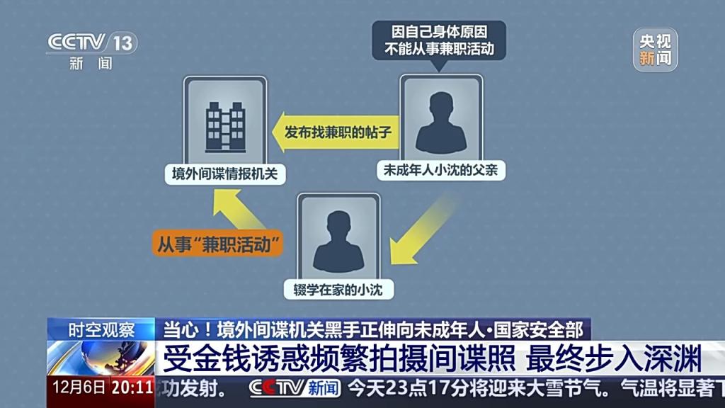 近年来,国家安全机关在案件侦办中发现,境外间谍情报机关常以网络兼职、异性交友为名,通过网络等渠道对未成年人实施勾连。锁定目标之后,境外间谍情报机关会许诺提供报酬丰厚、内容简单的兼职机会,一步步诱导未成年人落入其设下的陷阱。