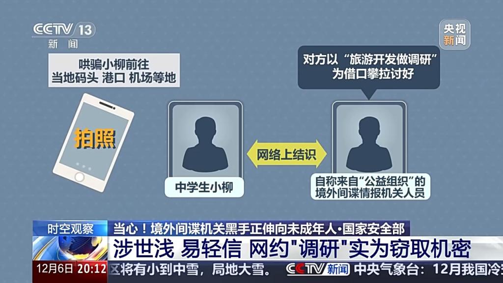 国际关系学院法学院教师 孔祥承:境外间谍机关目前都采取的是一种合法掩饰非法、公开掩护秘密的方式,对未成年人进行一个拉拢策反。在多数情况下,他们会比如说伪装成知心大姐、知心哥哥的方式,然后去影响这些未成年人,因为一些未成年人往往涉世不深,就被他们的甜言蜜语所诱惑,而逐渐被他们所利用。可能还有一些更为恶劣的情况,比如说一旦一些未成年人意识到这是一个间谍行为,想及时收手,那么境外的间谍机关也会利用他之前的行为作为把柄威胁他,导致他不得不继续从事相关的行为,受他们的摆布,成为一个傀儡。
